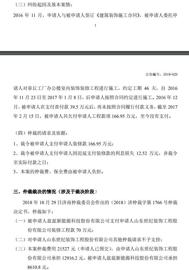 世紀(jì)股份現(xiàn)要求,茲茲能源支付剩余工程167萬元并承擔(dān)訴訟費用?,F(xiàn)濟南仲裁委做出仲裁為,茲茲能源支付世紀(jì)股份工程款70萬元,并駁回世紀(jì)股份其他要求。