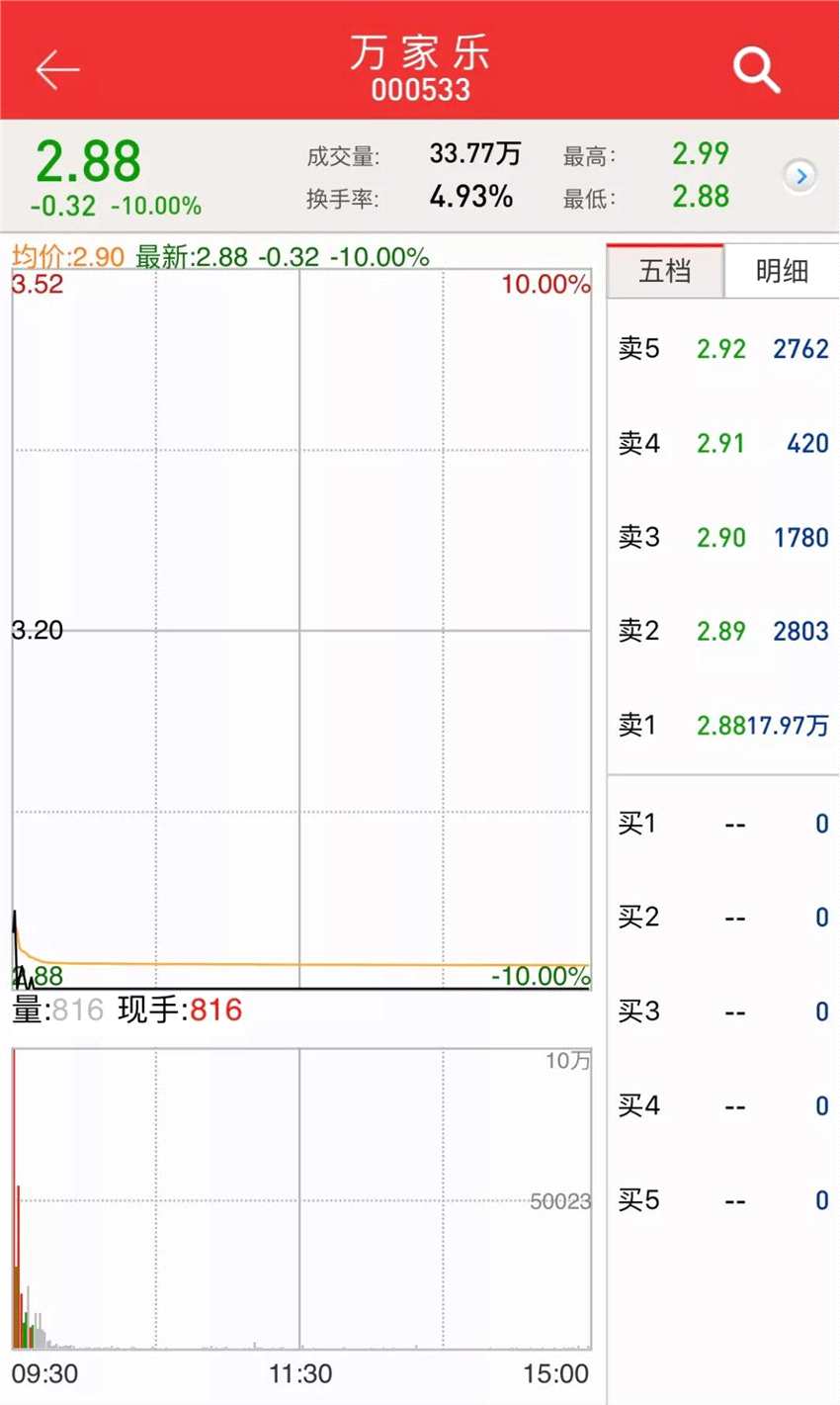 今天,漩渦中的萬家樂股價再度跌停。股價鎖定在2.88元每股,跌幅為10%。