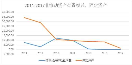 但資產總有賣完的一天,從固定資產可以看出些許跡象。如上圖所示,固定資產處于下滑態(tài)勢,從2011年3.4億,下降到2015年的8516.29萬,降幅75%。然而2015年已經無資產可賣,非流動資產處置損益也幾乎降到零點,2015年和2016年連續(xù)兩年虧損,分別實現(xiàn)歸母凈利潤-8207萬元和-9846萬元。根據(jù)相關規(guī)定,公司股票于2017年5月3日起被實施風險警示。