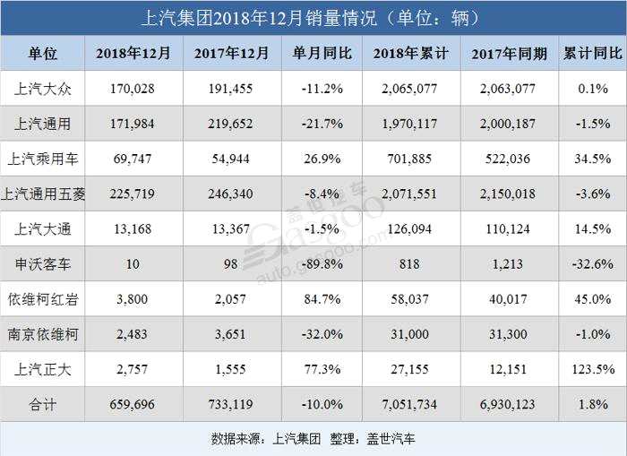 1月4日晚,【上汽集團(tuán)(600104)、股吧】(600104)公布其2018年12月及全年銷量數(shù)據(jù)。數(shù)據(jù)顯示,上汽集團(tuán)12月銷量共計659,696輛,相較11月份情況有所好轉(zhuǎn),實現(xiàn)了2.5%的增長,不過在車市大環(huán)境低迷的情況之下,上汽集團(tuán)12月銷量仍然低于上年同期。而從累計銷量來看,上汽集團(tuán)2018年銷量共計7,051,734輛,相較同期仍然增長了1.8%。結(jié)合此前月份車市的表現(xiàn)來看,2018年整體車市大概率負(fù)增長,在這一情況之下,能有如此表現(xiàn)值得稱贊,連上汽集團(tuán)都在其公眾號上高調(diào)表示“行業(yè)龍頭不是說說而已”。