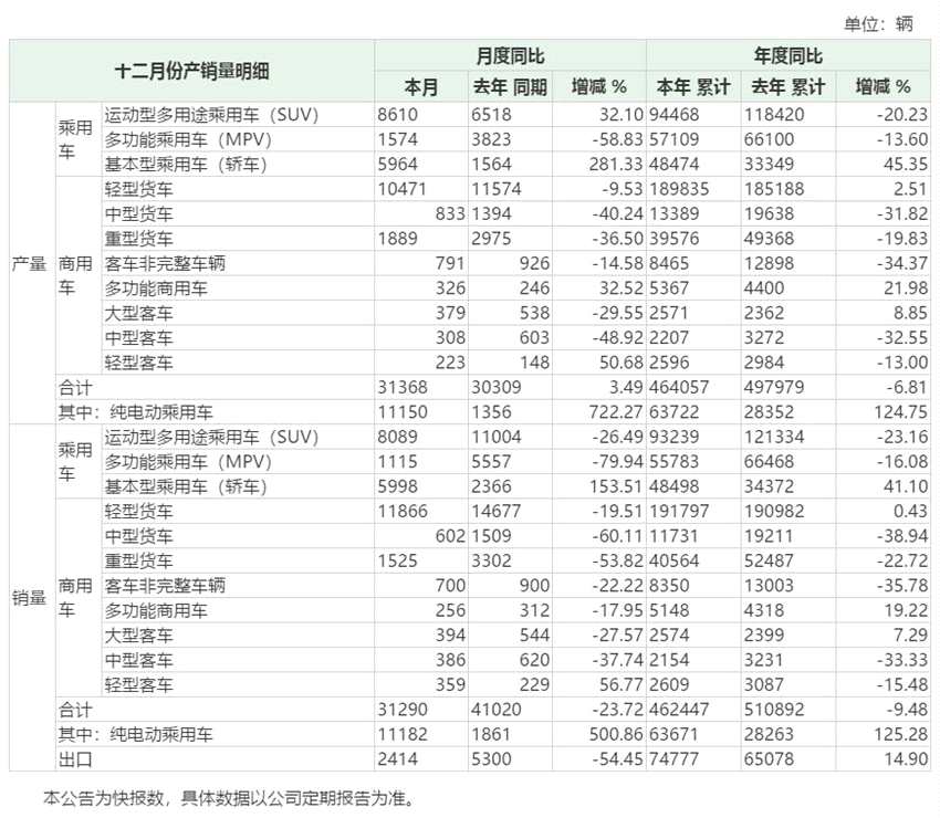 江淮汽車最新公布的產(chǎn)銷快報(bào)顯示,2018年,公司共生產(chǎn)汽車46.4萬輛,同比下滑6.8%;銷售汽車46.2萬輛,同比下滑9.5%。產(chǎn)銷率99.7%。