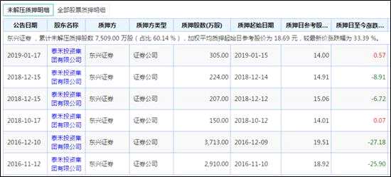 這些新增質(zhì)押多為解質(zhì)押后的重新質(zhì)押,可見公司2018年整體資金面還是相當緊張的。隨著泰禾集團股價一路下跌,各股東質(zhì)押率不斷走高。正如本次公告所指出的,此次補充質(zhì)押的質(zhì)押權方為【東興證券(601198)、股吧】,而在2018年針對于2016年的兩筆與東興證券的質(zhì)押融資,泰禾投資集團已經(jīng)針對性的補充質(zhì)押股份達4次,如下圖所示。