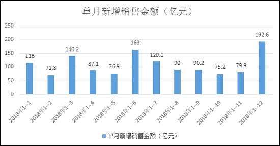 克而瑞數(shù)據(jù)顯示,2018年泰禾集團銷售金額1303千億元,同比增長29.37%,銷售面積534.9萬平方米,同比增長20.69%,位居行業(yè)第20位。如下圖所示,泰禾集團今年的銷售情況可謂是“高開低走”,從上半年的銷售金額同比高達61.73%的增速下降至年底,單月銷售金額從6月份開變掉頭向下一直到11月份,僅年底12月份銷售金額“突擊”大幅提升??梢?,在“房住不炒”的持續(xù)調(diào)控背景下,有著強勁發(fā)展歷史的泰禾集團也面臨巨大的回款壓力。