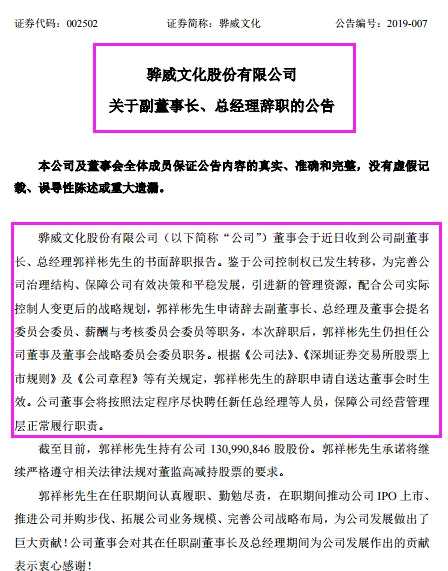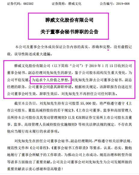 2019年1月17日,【驊威文化(002502)、股吧】(002502)股份有限公司(股票簡稱:驊威文化:股票代碼:002502)分別對外發(fā)布了《關(guān)于副董事長、總經(jīng)理辭職的公告》、《關(guān)于董事會秘書辭職的公告》、《關(guān)于證券事務(wù)代表辭職的公告》、《關(guān)于高級管理人員辭職及聘任高級管理人員的公告》引發(fā)市場高度關(guān)注。