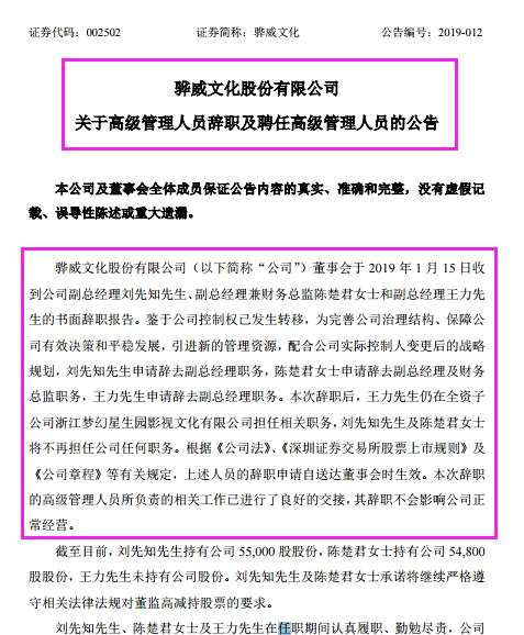 驊威文化董事會于2019年1月15日收到公司副總經(jīng)理劉先知先生、副總經(jīng)理兼財務(wù)總監(jiān)陳楚君女士和副總經(jīng)理王力先生的書面辭職報告。鑒于公司控制權(quán)已發(fā)生轉(zhuǎn)移,為完善公司治理結(jié)構(gòu)、保障公司有效決策和平穩(wěn)發(fā)展,引進新的管理資源,配合公司實際控制人變更后的戰(zhàn)略規(guī)劃,劉先知先生申請辭去副總經(jīng)理職務(wù),陳楚君女士申請辭去副總經(jīng)理及財務(wù)總監(jiān)職務(wù),王力先生申請辭去副總經(jīng)理職務(wù)。
