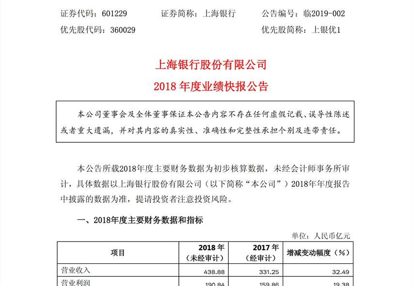 另外,在1月19日,上海銀行還發(fā)布了《上海銀行股份有限公司2018年度業(yè)績(jī)快報(bào)公告》(下稱“快報(bào)”),披露了2018年的未經(jīng)審計(jì)的財(cái)務(wù)狀況。
