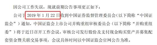 新力金融(600318)(維權(quán))1月23日發(fā)布一則更正公告,公告稱,公司于2019年1月22日收到證監(jiān)會(huì)通知,證監(jiān)會(huì)并購重組委將于近日召開工作會(huì)議,審核公司發(fā)行股份及支付現(xiàn)金購買資產(chǎn)并募集配套資金暨關(guān)聯(lián)交易事項(xiàng)。而在此前的公告中,新力金融稱該項(xiàng)通知于2019年1月21日收到,而對(duì)于此次更正,公司稱因工作失誤。