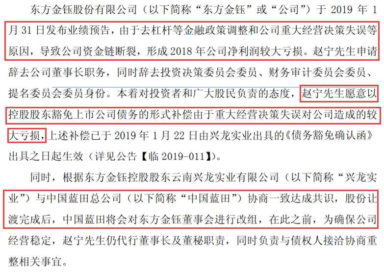 趙寧因此申請(qǐng)辭去公司董事長、投資決策委員會(huì)委員、財(cái)務(wù)審計(jì)委員會(huì)委員、提名委員會(huì)委員身份的同時(shí),此外他還宣布豁免興龍實(shí)業(yè)向東方金鈺出借的6.8億元借款本息的償還義務(wù)。而趙寧正是興龍實(shí)業(yè)的大股東和實(shí)控人。
