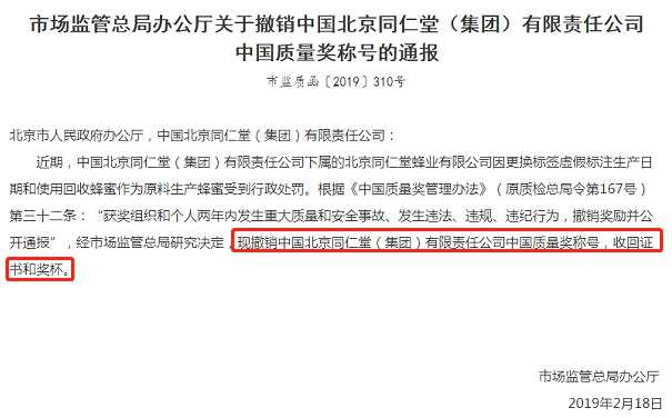 通報稱,近期,同仁堂下屬的同仁堂蜂業(yè)因更換標簽虛假標注生產(chǎn)日期和使用回收蜂蜜作為原料生產(chǎn)蜂蜜受到行政處罰。根據(jù)《中國質(zhì)量獎管理辦法》第三十二條:“獲獎組織和個人兩年內(nèi)發(fā)生重大質(zhì)量和安全事故、發(fā)生違法、違規(guī)、違紀行為,撤銷獎勵并公開通報”,經(jīng)市場監(jiān)管總局研究決定,現(xiàn)撤銷中國北京同仁堂(集團)有限責任公司中國質(zhì)量獎稱號,收回證書和獎杯。