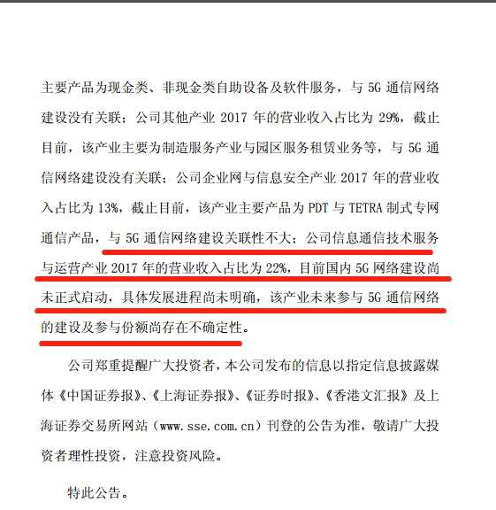 上圖為2月20日晚間,東方通信披露的風(fēng)險(xiǎn)提示公告,公司表示:旗下某產(chǎn)業(yè)主要產(chǎn)品為PDT與TETRA制式專網(wǎng)通信產(chǎn)品,與5G通信網(wǎng)絡(luò)建設(shè)關(guān)聯(lián)性不大;公司信息通信技術(shù)服務(wù)與運(yùn)營(yíng)產(chǎn)業(yè)2017年的營(yíng)業(yè)收入占比為22%,目前國(guó)內(nèi)5G網(wǎng)絡(luò)建設(shè)尚未正式啟動(dòng),具體發(fā)展進(jìn)程尚未明確,該產(chǎn)業(yè)未來參與5G通信網(wǎng)絡(luò)的建設(shè)及參與份額尚存在不確定性。