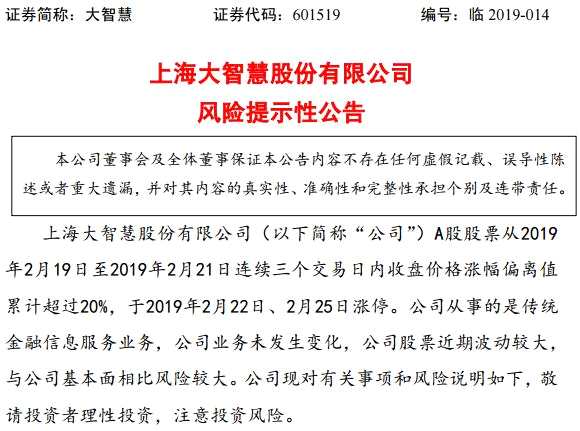 對于公司股價的漲漲漲,大智慧多次發(fā)布風險警示,稱公司從事的是傳統(tǒng)金融信息服務業(yè)務,公司業(yè)務未發(fā)生變化,公司股票近期波動較大,與公司基本面相比風險較大。