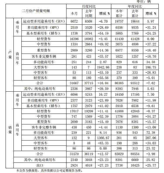 就2月份銷量數(shù)據(jù)看,江淮乘用車和商用車均呈下跌態(tài)勢,其中,乘用車銷量為10,230臺(tái),同比下跌9.83%;而商用車主銷類別如輕型貨車、重型貨車等同比均出現(xiàn)10%的下挫。