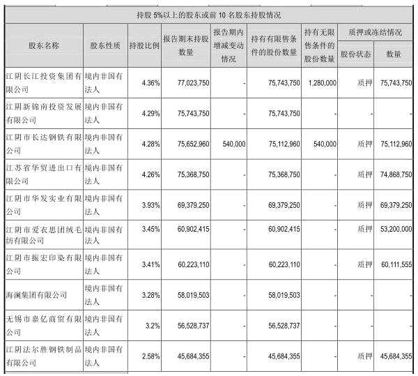 其中,江陰長(zhǎng)江投資(600119)集團(tuán)有限公司質(zhì)押股份數(shù)量為7574.38萬(wàn)股、江陰市長(zhǎng)達(dá)鋼鐵有限公司質(zhì)押股份數(shù)量為7511.30萬(wàn)股、江蘇省華貿(mào)進(jìn)出口有限公司質(zhì)押股份數(shù)量為7486.88萬(wàn)股、江陰市華發(fā)實(shí)業(yè)有限公司質(zhì)押股份數(shù)量為6937.93萬(wàn)股、江陰市愛(ài)衣思團(tuán)絨毛紡有限公司質(zhì)押股份數(shù)量為5320萬(wàn)股、江陰市振宏印染有限公司質(zhì)押股份數(shù)量為6011.16萬(wàn)股、江陰【法爾勝(000890)、股吧】(000890)鋼鐵制品有限公司質(zhì)押股份數(shù)量為4568.44萬(wàn)股。