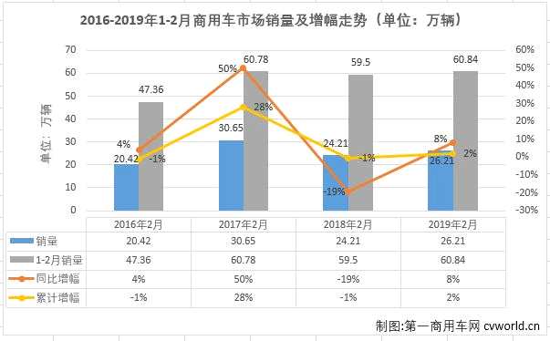 最新獲悉,2019年2月份,我國(guó)商用車市場(chǎng)銷售26.21萬輛,同比增長(zhǎng)8%,比去年2月份多銷售約2萬輛。