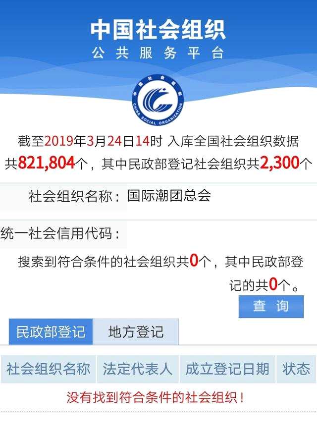 據(jù)中國(guó)社會(huì)組織網(wǎng)查詢,未查詢到“國(guó)際潮團(tuán)總會(huì)”、“國(guó)際潮團(tuán)聯(lián)誼年會(huì)”2個(gè)組織有在國(guó)內(nèi)登記備案分支機(jī)構(gòu)的信息。