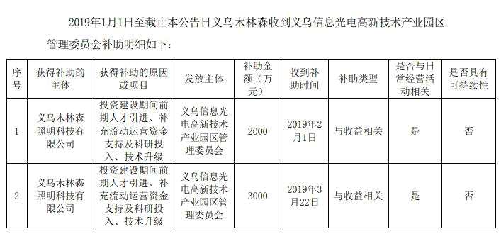 另據(jù)資料顯示,今年2月1日木林森收到過義烏信息光電高新技術(shù)產(chǎn)業(yè)園區(qū)管理委員會(huì)補(bǔ)助2000萬元,理由是投資建設(shè)期間前期人才引進(jìn)、補(bǔ)充流動(dòng)運(yùn)營(yíng)資金