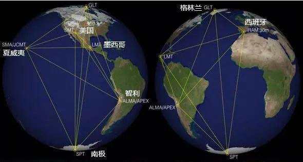 因此EHT項目誕生,由美國夏威夷的亞毫米波陣列(SMA)、詹姆斯.克拉克.麥克斯韋望遠鏡(JCMT)、加利福尼亞州的毫米波組合陣列(CARMA)、亞利桑那州的亞毫米波望遠鏡(SMT)、墨西哥的大型毫米波望遠鏡(LMT)、智利北部的阿塔卡馬大型毫米波陣列(ALMA)和阿塔卡馬【探路者(300005)、股吧】(300005)實驗(APEX)、南極望遠鏡(SPT)、格陵蘭島望遠鏡GLT)、西班牙貝萊塔峰的30米望遠鏡(IRAM30m)以及法國的布爾高原干涉儀等射電望遠鏡和干涉儀組成。