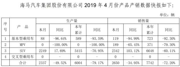 此外,根據(jù)*ST海馬5月7日披露的2019年4月份產(chǎn)品產(chǎn)銷數(shù)據(jù)快報顯示,其4月份汽車產(chǎn)量為2337輛,同比減少49.52%;汽車銷量2650輛,同比減少34.95%。前4月,*ST海馬累計汽車銷售量7742輛,同比減少72.2%。其MPV前4月更是零產(chǎn)出。