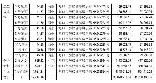 5月15日晚,*ST海馬發(fā)布公告稱,為優(yōu)化和盤活存量資產(chǎn),公司擬公開出售位于??谑薪鸨P工業(yè)開發(fā)區(qū)創(chuàng)業(yè)新村一區(qū)、二區(qū)及金盤工業(yè)區(qū)金盤大道旁的部分閑置房產(chǎn)。其中,住宅269套(總面積14,685.04平方米),商鋪15套(總面積2,729.12平方米)。賬面原值為3090萬元,最終處置價格以成交價為準(zhǔn)。