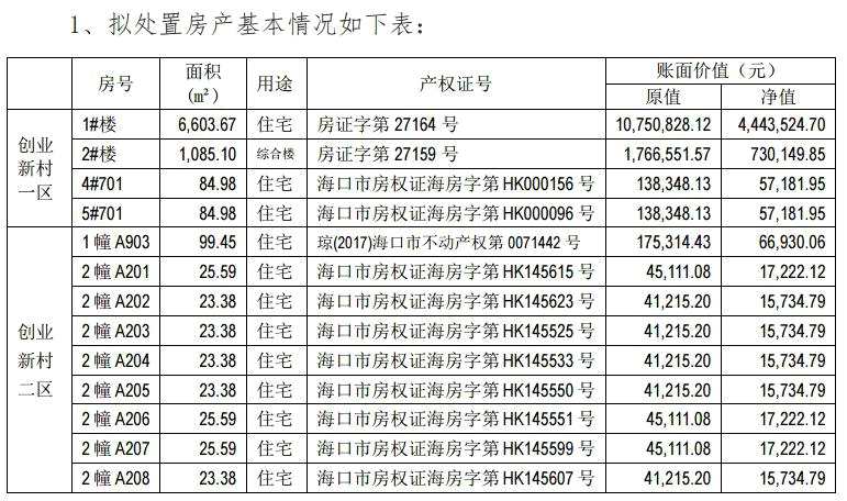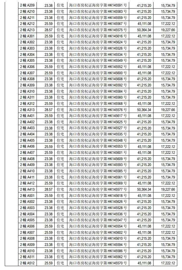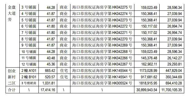 其中,住宅269套(總面積14,685.04平方米),商鋪15套(總面積2,729.12平方米),賬面價值原值為30,899,943元,最終處置價格以成交價為準(zhǔn)。