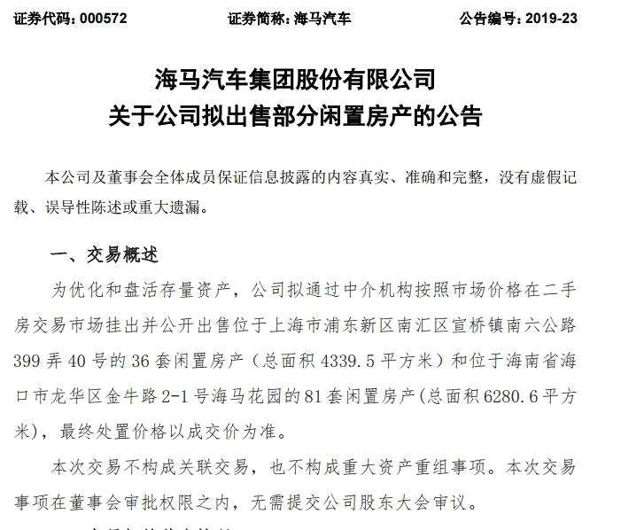 就在不久前的4月22日晚間,海馬汽車發(fā)公告說,擬通過中介機(jī)構(gòu)按照市場價格在二手房交易市場掛出并公開出售位于上海市的36套閑置房產(chǎn)(總面積4339.5平方米),以及位于海南省??谑械?1套閑置房產(chǎn)(總面積6280.6平方米),賬面原值為3386.17萬元。