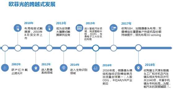 歐菲光是國(guó)內(nèi)光學(xué)光電領(lǐng)域領(lǐng)軍企業(yè)。2001年成立,2010年在深交所上市。早期的歐菲光還只有紅外截止濾光片等單品,幾年內(nèi)其紅外濾光片的產(chǎn)量就達(dá)到全球第一,市占率超三分之一;2008年公司切入手機(jī)觸摸屏領(lǐng)域,在全球智能手機(jī)發(fā)展的行業(yè)背景下擴(kuò)展自身業(yè)務(wù),成為全球最大的薄膜式觸摸屏供應(yīng)商;2012年公司進(jìn)入影像領(lǐng)域,一年時(shí)間成為全球消費(fèi)電子攝像頭模組龍頭;2014年公司進(jìn)入指紋識(shí)別領(lǐng)域,并在亞洲建成世界最大的指紋識(shí)別工廠;2015年公司再次切入智能汽車領(lǐng)域。