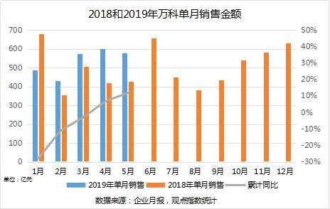 公告顯示,2019年1-5月份,萬科累計(jì)實(shí)現(xiàn)合同銷售面積1660.8萬平方米,合同銷售金額2676.0億元,同比上升11.97%;而5月單月的銷售金額579.9億元,較上個(gè)月環(huán)比微跌3.6%。