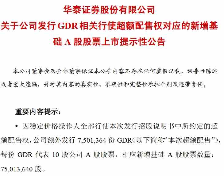華泰證券:GDR超額配售的7501萬股預(yù)計上市日期為6月27日