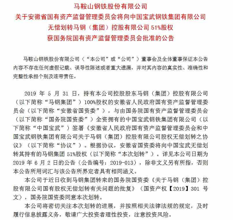 馬鋼股份:經(jīng)國(guó)資委批準(zhǔn)將51%股權(quán)無(wú)償劃轉(zhuǎn)給中國(guó)寶武
