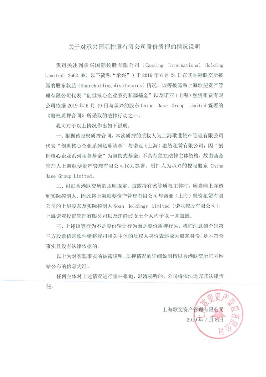 說明提到,2019年6月19日,上海歌斐資產(chǎn)管理有限公司(下稱“上海歌斐”)代表“創(chuàng)世核心企業(yè)系列私募基金”以及諾亞(上海)融資租賃有限公司(下稱“諾亞融資租賃”)與承興國際控股的控股股東China Base Group Limited簽署《股權(quán)質(zhì)押合同》(下稱“合同”)。根據(jù)合同,本次質(zhì)押的質(zhì)權(quán)人為上海歌斐代表“創(chuàng)世核心企業(yè)系列私募基金”與諾亞融資租賃。因“創(chuàng)世核心企業(yè)系列私募基金”為契約式基金,不具有獨(dú)立法律主體資格,故由基金管理人上海歌斐代為簽署,質(zhì)押人為China Base Group Limited。