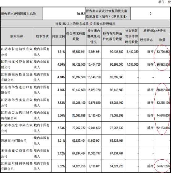 第五大股東江陰市華發(fā)實業(yè)有限公司報告期末持股數(shù)量為8325.51萬股,持股比例為3.83%,質(zhì)押股份8325.51萬股;