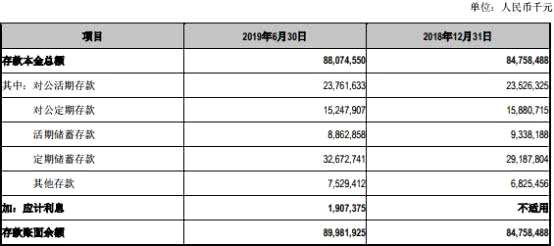 2019年上半年,江陰銀行存款本金總額為880.75億元,截至2018年末為847.58億元;存款賬面余額為899.82億元,截至2018年末為847.58億元。