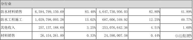 具體來看此次業(yè)績報(bào)告,分業(yè)務(wù)來看,主營業(yè)務(wù)較為突出,防水材料實(shí)現(xiàn)收入65.95億元,同比增長41.89%,占比83.4%,防水工程實(shí)現(xiàn)收入10.3億元,同比增長49.77%,占比13.02%,其它業(yè)務(wù)占比較小。