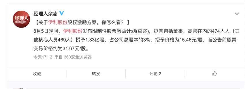 在網(wǎng)絡(luò)上,有眾多聲音評(píng)論伊利股份的本次激勵(lì)計(jì)劃,有聲音甚至表示,這次激勵(lì)方案僅僅起到了留人的效果。