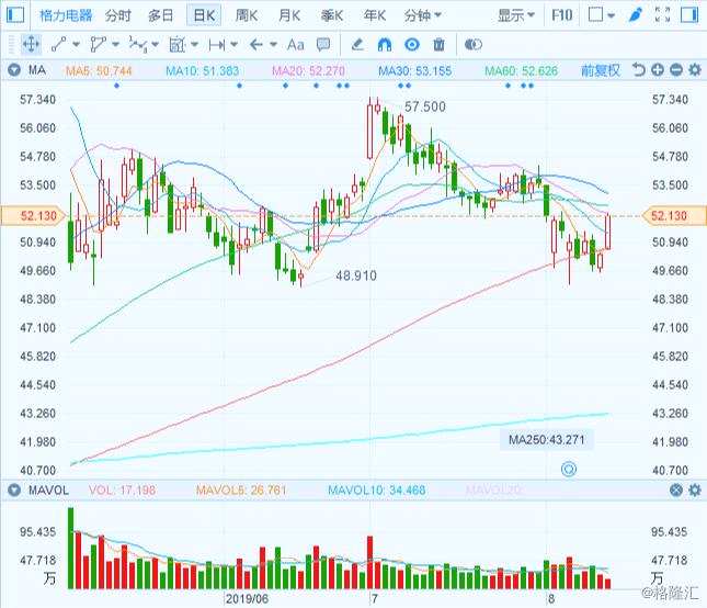 互聯(lián)網(wǎng)8月13日丨【格力電器(000651)、股吧】(000651)今日股價高開高走,現(xiàn)漲3.47%,報52.13元,暫成交8.87億元,最新總市值為3136億元。