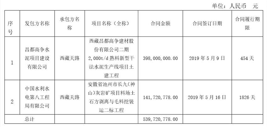 發(fā)包方昌都高爭(zhēng)水泥項(xiàng)目建設(shè)有限公司,承包方西藏天路,項(xiàng)目西藏昌都高爭(zhēng)建材股份有限公司二期2,000t/d熟料新型干法水泥生產(chǎn)線項(xiàng)目土建工程,合同總額398,000,000.00元,簽訂日期;2019年5月9日;合同履行期限454天。