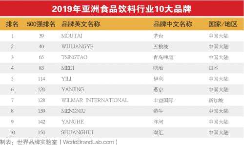 《亞洲品牌500強》自2006年開始每年發(fā)布一次,由世界品牌實驗室對亞洲品牌進行測評,評判標(biāo)準(zhǔn)是品牌影響力,主要指品牌開拓市場、占領(lǐng)市場、并獲得利潤的能力,基本指標(biāo)包0括市場占有率、品牌忠誠度和亞洲領(lǐng)導(dǎo)力。2019年《亞洲品牌500強》共有來自22個國家和地區(qū),金融、傳媒、食品飲料、信息技術(shù)、零售、汽車和石油化工等40個相關(guān)行業(yè)的品牌入選。其中,食品飲料行業(yè)共有43個品牌入選,茅臺、五糧液、【青島啤酒(600600)、股吧】(600600)位列前三名。