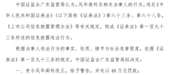 8月28日晚間,【風(fēng)華高科(000636)、股吧】(000636)發(fā)布公告稱,公司及相關(guān)當(dāng)事人已于8月27日收到中國證監(jiān)會廣東監(jiān)管局下發(fā)的《行政處罰事先告知書》(廣東證監(jiān)處罰字[2019]12號)。