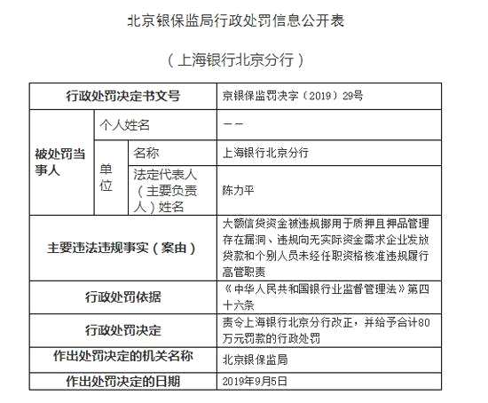 上海銀行北分被罰80萬:大額信貸資金違規(guī)挪用于質(zhì)押