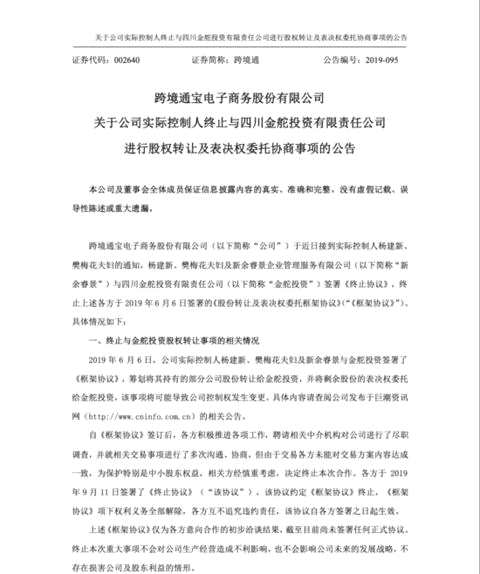 據(jù)了解,今日,跨境通寶電子商務(wù)股份有限公司(簡稱“跨境通”)發(fā)布了《關(guān)于公司實(shí)際控制人終止與四川金舵投資有限責(zé)任公司進(jìn)行股權(quán)轉(zhuǎn)讓及表決權(quán)委托協(xié)商事項(xiàng)的公告》,公告顯示:楊建新、樊梅花夫婦及新余睿景企業(yè)管理服務(wù)有限公司與四川金舵投資有限責(zé)任公司(以下簡稱“金舵投資”)簽署《終止協(xié)議》,終止了各方于2019年6月6日簽署的《股份轉(zhuǎn)讓及表決權(quán)委托框架協(xié)議》。