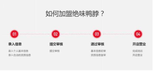 絕味鴨脖怎么加盟?它的加盟手段相當(dāng)簡單,加盟流程也很簡單,雖然絕味鴨脖會有自身嚴(yán)格的篩選方式,但只要你認(rèn)可平臺的發(fā)展路線,并且愿意跟隨著他的步伐,擁有可以支配的財(cái)富,那么品牌會相當(dāng)歡迎你。故不用擔(dān)心絕味鴨脖難以加盟,你只需要真正開始了解它,你就會愛上它。你可以點(diǎn)進(jìn)絕味鴨脖的官網(wǎng),錄入個(gè)人的信息以及資質(zhì)信息,提交審核,數(shù)天之后就會有相關(guān)人員通過審核來與你聯(lián)系。絕味鴨脖怎么加盟?——就是如此“簡單”。