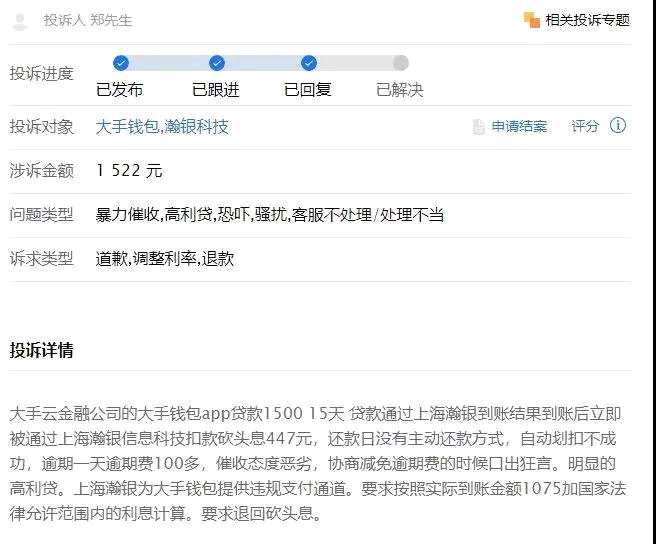 而通過朱先生披露的賬單來看,他于9月6日已經(jīng)還款1522.5元。按此計算,大手錢包綜合貸款年利率超過1000%,遠高于36%的監(jiān)管紅線。惡意逾期收取高額逾期費聚投訴平臺提供的信息顯示,大手錢包除了收取高額砍頭息,還存在惡意逾期,收取用戶高額逾期費的情況。9月3日,用戶鄭先生投訴稱,他用大手錢包app貸款1500元,期限15天。還款日沒有主動還款方式,自動劃扣也沒有成功,逾期一天的逾期費就有100多,并且催收方態(tài)度惡劣,協(xié)商減免逾期費時還對他口出狂言。
