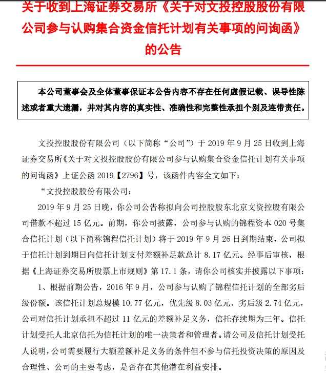上交所關注到了文投控股有關錦程信托計劃、擬借款不超過15億元等事項,并發(fā)出了問詢函,要求公司及信托計劃受托人說明,公司需要履行大額差額補足義務的條件但不參與信托投資決策的原因及合理性、公司的主要考慮,是否存在其他潛在利益安排。