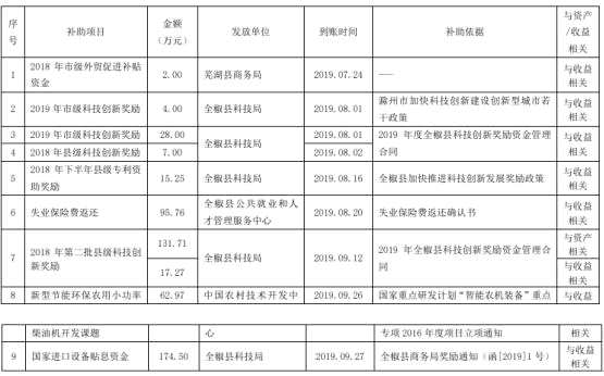 全柴動力及下屬子公司累計收到與資產(chǎn)或收益相關(guān)的政府補助款538萬元