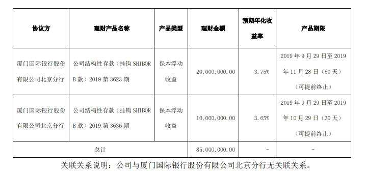 摘要: 10月1日,嘉友國際(603871)今日發(fā)布公告,2019年9月29日,公司使用閑置募集資金總計人民幣85,000,000.00元,向廈門國際銀行股份有限公司北京分行購買了結(jié)構(gòu)性存款產(chǎn)品。公告顯示,具