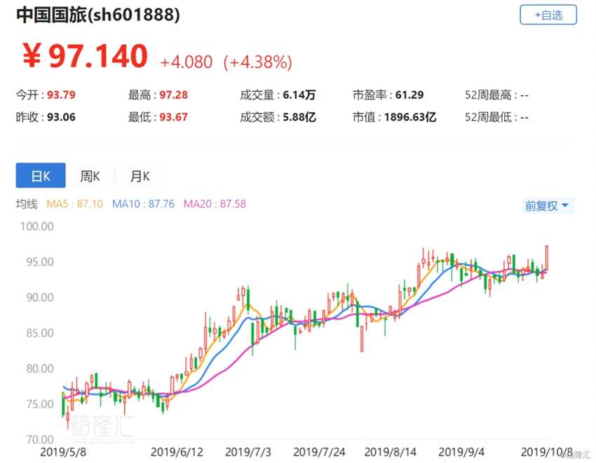 摘要: 互聯(lián)網(wǎng)10月8日丨白馬股中國(guó)國(guó)旅(601888)漲逾4%,報(bào)97.14元,高見(jiàn)97.28元,創(chuàng)下其上市以來(lái)的歷史新高,且有望躋身百元股行列,成交5.88億元,總市值1897億元。中信證券今日發(fā)布研報(bào),