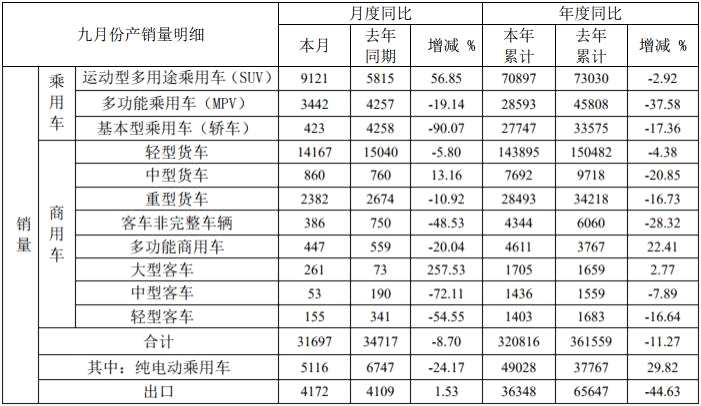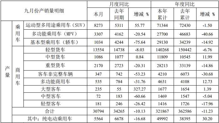 江淮汽車9月份產(chǎn)量數(shù)據(jù)如下: