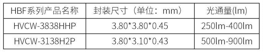 測(cè)試電流為1A HVCW-3838HHP和HVCW-3138H2P,采用QFN封裝形式,使用精密的封裝技術(shù),能夠?qū)崿F(xiàn)均勻的光分布和指定的明暗邊界。