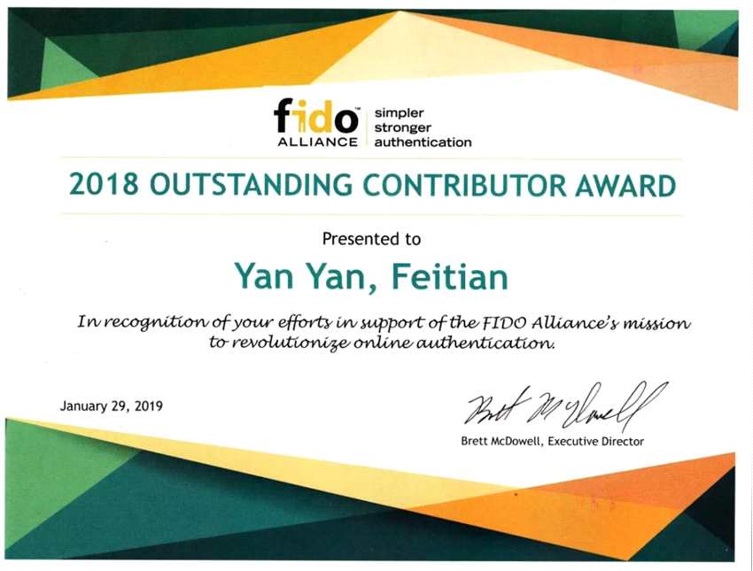 早在2014年,飛天誠(chéng)信便加入FIDO聯(lián)盟,并于2016年晉升為FIDO聯(lián)盟董事會(huì)成員,成為國(guó)內(nèi)繼聯(lián)想、阿里巴巴之后的第三個(gè)FIDO聯(lián)盟董事會(huì)成員。2018年初,閆巖先生擔(dān)任FIDO聯(lián)盟中國(guó)工作組(FCWG)的聯(lián)合主席,在任職期間,其本人以及公司,在積極推動(dòng)身份認(rèn)證標(biāo)準(zhǔn)本土化落地的工作中得到了FIDO聯(lián)盟的官方認(rèn)可,閆巖先生也因此榮獲FIDO聯(lián)盟全球2018年度杰出貢獻(xiàn)獎(jiǎng)。