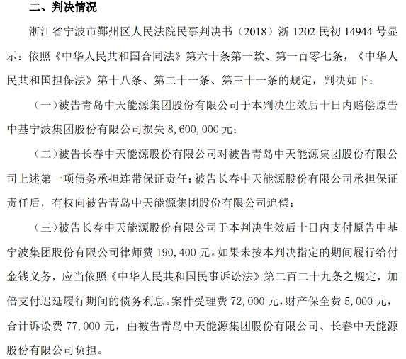 ST中天稱,本次訴訟因生效司法裁判確定的還款義務(wù),公司需向中基寧波支付執(zhí)行標(biāo)的金額8,790,400元及申請(qǐng)執(zhí)行費(fèi)。本次訴訟可能將對(duì)公司本期利潤或期后利潤產(chǎn)生影響。